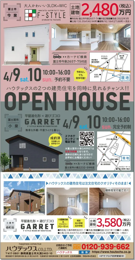 4/9(土)・10(日)富士市今泉F-STYLE・富士宮市小泉GARRETの完成見学会を開催します。